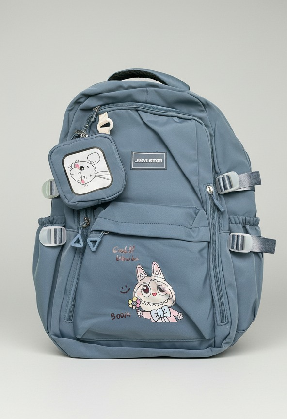 Crafted from a lightweight yet durable fabric in a soothing blue-grey hue, this backpack exudes a gentle charm. The front features a captivating graphic of a sweet, wide-eyed bunny, accompanied by playful “Cool ‘n’ Cute” and “Boom” text – sure to bring a smile to anyone’s face. Adding to its unique appeal is a charming, detachable mini-pouch adorned with an adorable cartoon mouse, perfect for storing coins, keys, or tiny treasures. The subtle “JIAOYI STOR” branding assures quality and a touch of designer appeal.