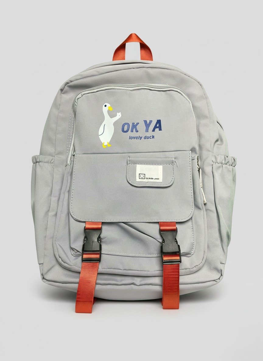 Crafted from durable, lightweight material, this light grey backpack is built to withstand the rigors of a child’s busy day. The front is adorned with an adorable white duck graphic and the cheerful “OK YA lovely duck” slogan in vibrant blue, sure to bring a smile to any child’s face. Bright orange webbing straps with secure buckles add a pop of color and extra security, reflecting a fun and adventurous spirit.