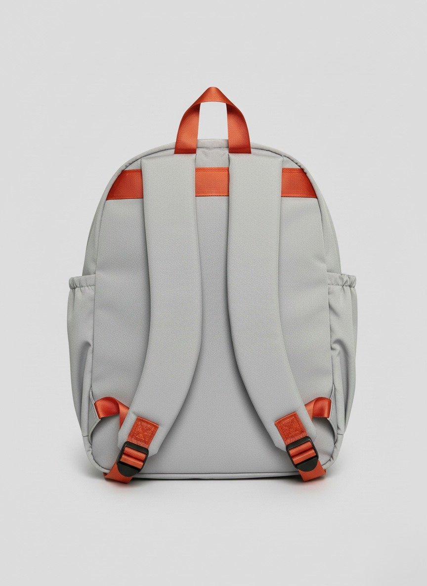 Straps:Â Adjustable padded shoulder straps, top carry handle with orange accent.
